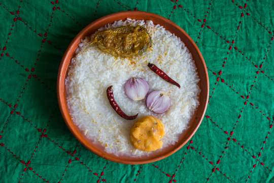 Traditional Panta Ilish for Bengali New Year (Pohela Boishakh). Rice, aloo bhorta, chili, onion, and fried Hilsa fish on clay plate. Popular in Bangladesh and India.