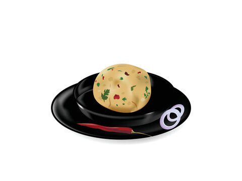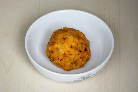 Delicious Aloo Bharta on a white bowl. It is traditional Bengali (Bangladeshi) food. It is known for its simplicity and flavorful taste.