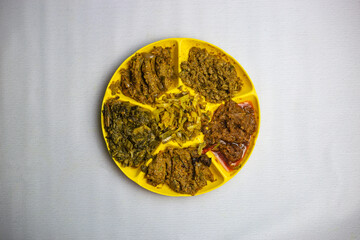 Assorted Bhorta Bhaj or bhaji with aloo, eggplant, baingan, tomato vorta served in plate isolated on background top view of bangladeshi, indian and pakistani traditional spicy food