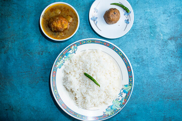Plain Rice with egg curry and alu bhorta served in plate isolated on grey background top view of bangladeshi food