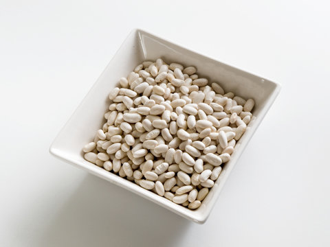 bowl cuadrado blanco lleno de alubias blancas