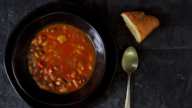Cuenco de guiso de alubias con chorizo sobre un mantel a cuadros azules.