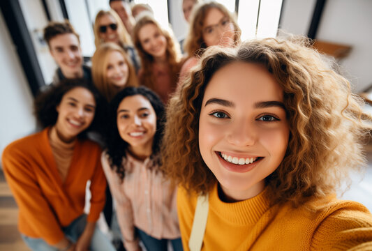 Primer plano de joven sonriente mirando la cámara con amigos en segundo plano