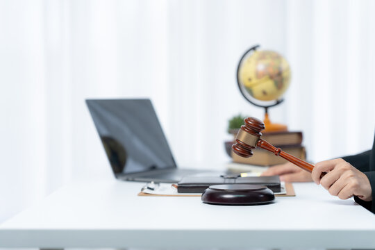 Justice in the Modern Age: A poised gavel signifies order amidst technology, a laptop standing sentinel. A globe, symbol of global impact, book and plant are in harmony.