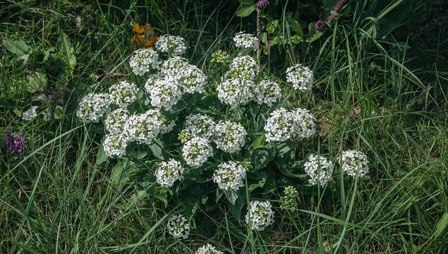 Lobularia maritima white and purple flowering plant of Brassicaceae. Sweet alyssum or sweet alison