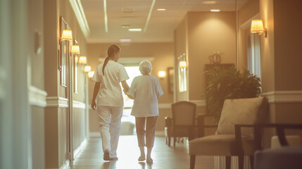 A home health care worker assists an elderly woman down the hallway of an assisted living home