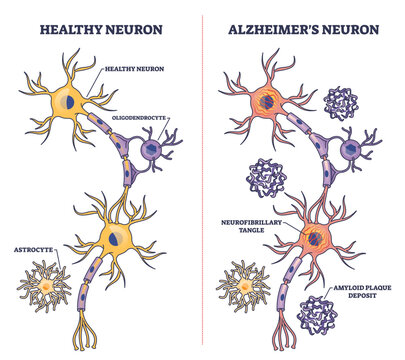 Alzheimers neuron diagram shows comparison of healthy and diseased neurons, highlighting amyloid plaques and neurofibrillary tangles. Outline diagram