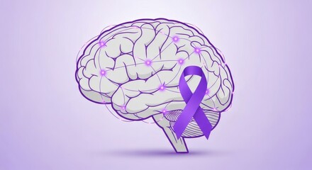 Human brain with purple ribbon for alzheimers disease awareness on purple gradient background