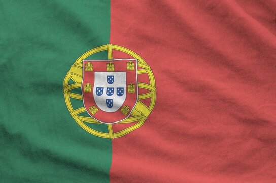 Portugal flag depicted on folded wavy fabric of old cloth close up