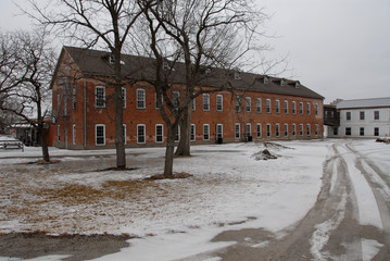 A serene view of the Amana Colonies' beautiful gardens and historic buildings at sunset
