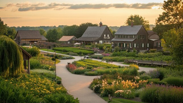 Picturesque sunset view of the Amana Colonies showcasing lush gardens and charming historic buildings along a winding path