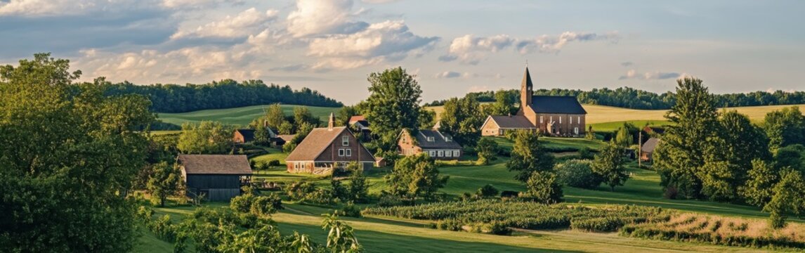 A scenic view of the Amana Colonies highlighting lush greenery and historic architecture during a tranquil afternoon