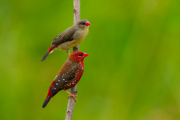 Sweet pair of red and brown bird perching together on wooden stick in romance moment, Red avadavat, munia or strawberry finch (Amandava amandava) in breeding plumage