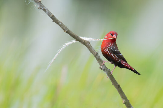 Red Avadavat Amandava amandava striking red bird white speckles perched on green grass stalks in a bright dewy meadow