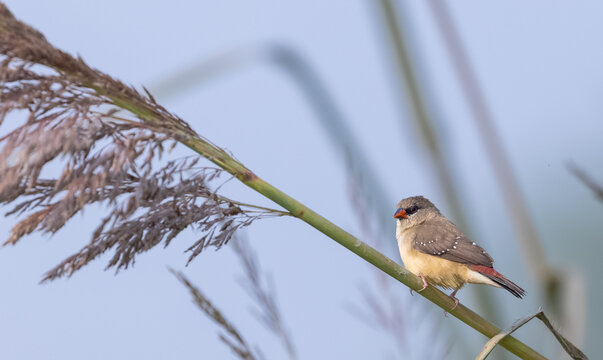 Red Avadavat (Amandava amandava), male perched on a grass stem, Sultanpur National Park and Bird Sanctuary, Delhi, India.