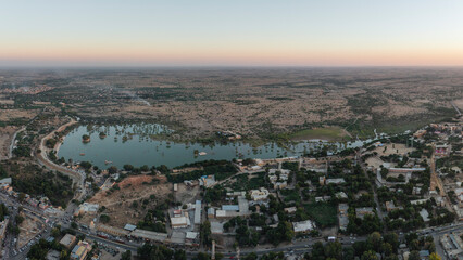 Aerial view of tranquil Amar Sagar Pol with serene lake and beautiful cityscape at dusk, Jaisalmer, Rajasthan, India.