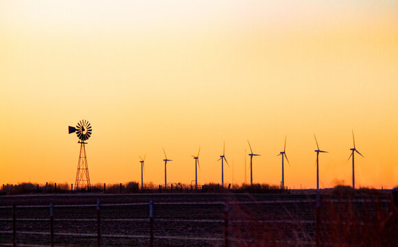 Old Windmill and Modern Turbines at Sunset on the Texas Plains