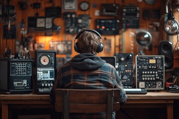 An amateur radio operator sitting at a desk, surrounded by vintage and modern radio equipment. Generative AI