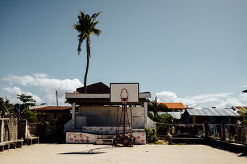 Shabby basketball court in the street on sunny day