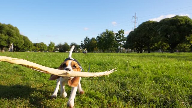 Clumsy doggy rush towards, want to catch wooden stick but miss, slow motion shot. Young beagle run from distance, long funny ears fly in air. Playful pet fail to snatch branch by mouth