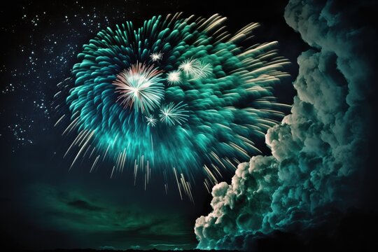 White, green, and blue fireworks over a nighttime blue sky. amateurish image commotion, grain. Generative AI