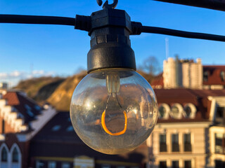 Image shows an outdoor scene with a clear, unlit light bulb suspended from a metal bracket, against the backdrop of Mediterranean-style buildings under a blue sky