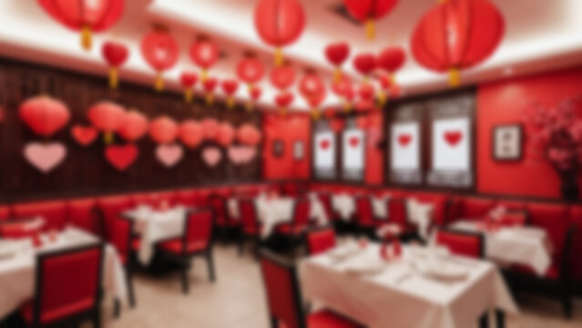 Blurred background of a modern Chinese restaurant with a Valentine's Day theme, there are love-shaped decorations installed on the walls, no people, bright lights.
