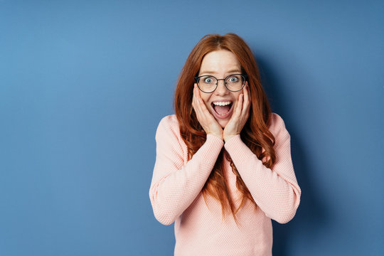 Surprised young woman with brown eyes and freckles, expressing amazement in her expression.