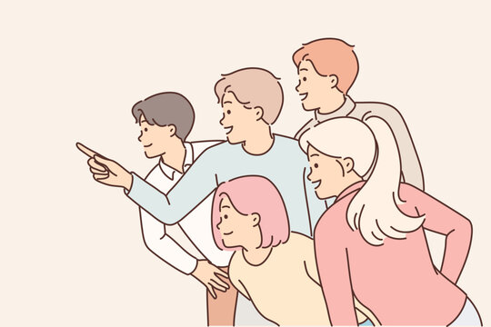 Group of people point finger to side and look at something amazing and eye-catching with smile
