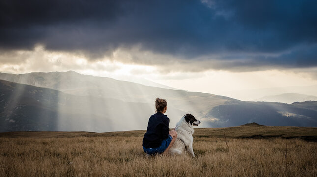 beautiful woman and corgi dog walk along seashore during evening sunset on autumn spbi. Side view of stylish person and cute pet are walking along sea beach and watching amazing golden sundown on warm