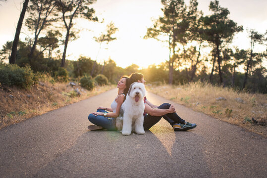 Side view of serene girlfriend and boyfriend sitting back to back on roadway with Old English Sheepdog and enjoying amazing sunset in summer