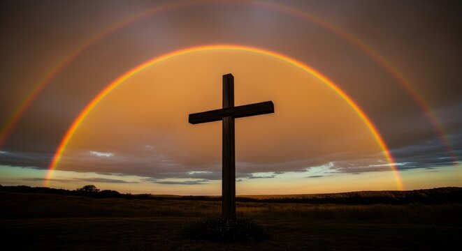 Cross and Double Rainbow Sunset - Silhouetted wooden cross stands in a field at sunset with a vibrant double rainbow arching overhead. Peaceful, spiritual
