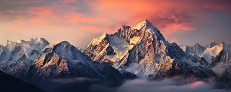 panoramic scene, blooming pink rhododendrons flowers, amazing panoramic nature scenery
