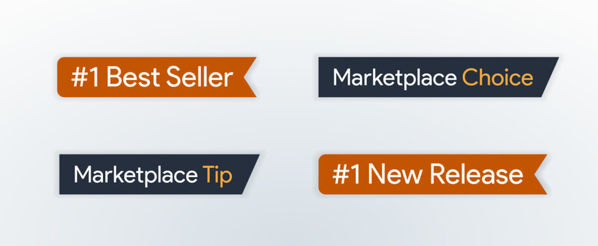 #1 Best Seller badge on Amazon. N1 New Release label. Online marketplace choice and Tip. Top performer logo. Internet retail. Private label attributes. Listing product details. Vector illustration.