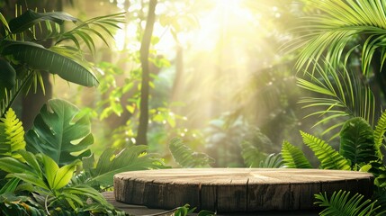 Jungle forest background with a wooden display podium, bathed in sunshine, ideal for organic cosmetics and food presentations