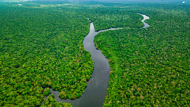 Meandering river winding through lush green rainforest, aerial view of Amazon basin landscape with dense vegetation canopy. Concept of nature, wilderness, ecology and biodiversity