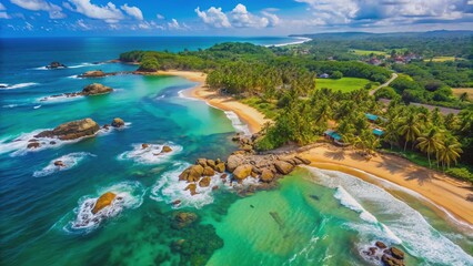 Panoramic aerial shot of serene Ambalangoda Beach featuring turquoise ocean waters contrasted against rugged rocky shores and lush green coastline landscape.