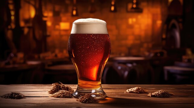A pint of rich, dark amber brewery bitter, head forming beautifully, served in a traditional glass Enjoy the aroma of malts and hops , foam, beer glass, tavern
