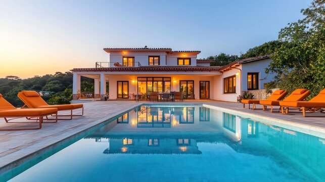 Amber lounge chairs by a pool at a vibrant house, clear evening sky.