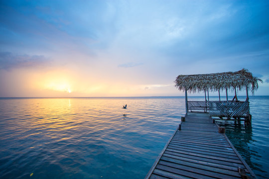 A bird is flying in the scene showing a wooden dock with a palapa roof and sunset. The water is calm and blue.