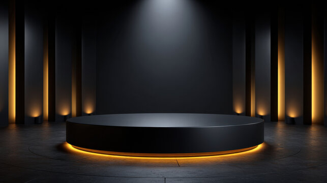 Black circular podium with warm yellow lighting in dark modern interior, spotlight shining down creating dramatic and elegant atmosphere for product display or presentation