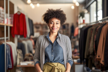 Portrait of black small business owner in her clothing store. Generative AI.