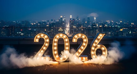 Spectacular 2026 new year celebration with cityscape, fireworks, and glowing numbers at night