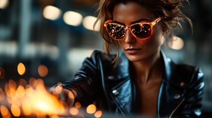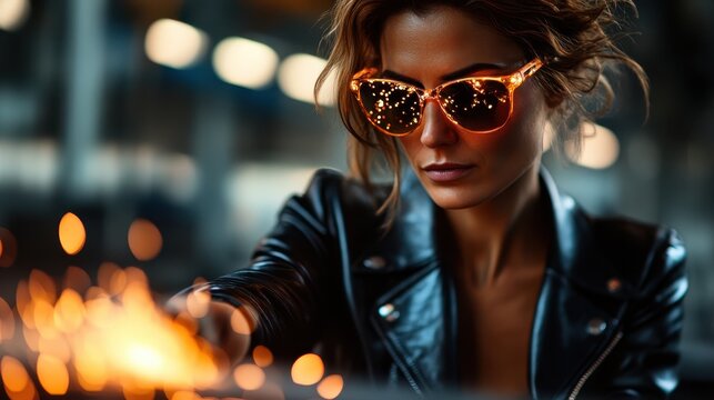 A confident woman wearing stylish sunglasses amidst flying sparks in a workshop, representing empowerment and strength in skilled craftsmanship and artistic labor.