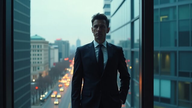 A confident professional wearing a suit appears poised among city skyscrapers, embodying ambition and success against a backdrop of urban architecture and high rise buildings.