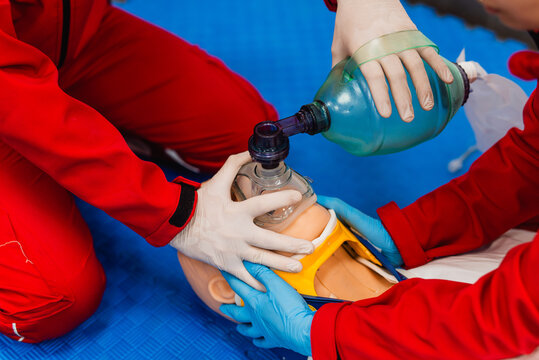 Woman holding breathing bag Ambu bag.Demonstrating CPR Cardiopulmonary resuscitation training medical procedure on CPR doll in the class.Paramedic demonstrate first aid practice for save life