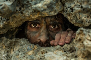 Soldier is hiding in a hole in the rocks, holding one rock and waiting to ambush the enemy