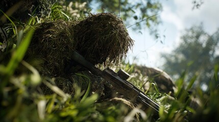 Camouflaged Sniper with Rifle in Lush Greenery Ambush Predator.