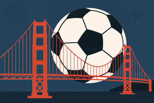 Golden Gate Bridge with rolling football, simple west-coast USA vector for World Cup 2026
