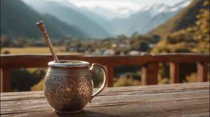 Traditional mate tea cup with bombilla on wooden table, serving as a cultural beverage concept with mountain view background.